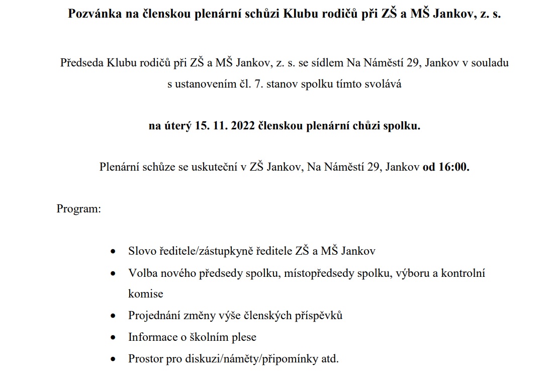 Pozvánka na plenární schůzi KR