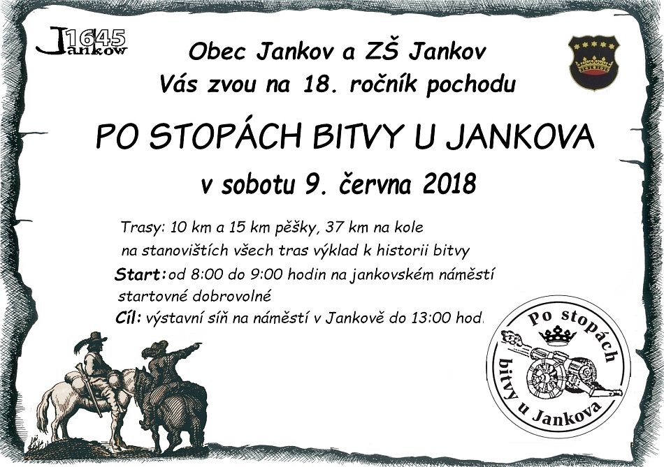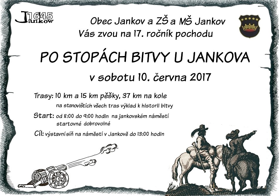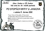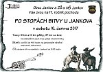 V sobotu 10. 6. 2017 se v Jankově uskutečnil tradiční pochod s názvem Po stopách bitvy u Jankova. Pochod byl zahájen v 8 hodin ráno hromadnými výstřely z dobových bambitek a děla. Účastníci pochodu si mohli vybrat ze tří různých tras. Dvě trasy byly určené pro pěší a jedna pro cyklisty. Každý účastník dostal na startu mapu trasy, podle které musel dorazit do cíle. Po cestě účastníci prošli několik stanovišť, kde si mohli poslechnout o bitvě zajímavé informace. Celkem odstartovalo 124 lidí a všichni úspěšně dorazili do cíle. Byla to příjemná akce a doufáme, že příští rok bude účast ještě vyšší. Miroslava Pánková, Tereza Kostková, Adéla Dašková, Barbora Koucká 9.třída