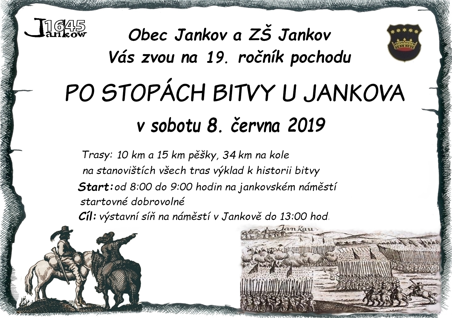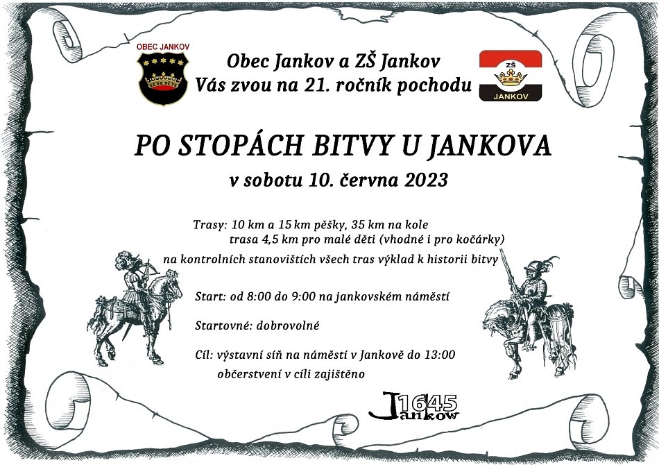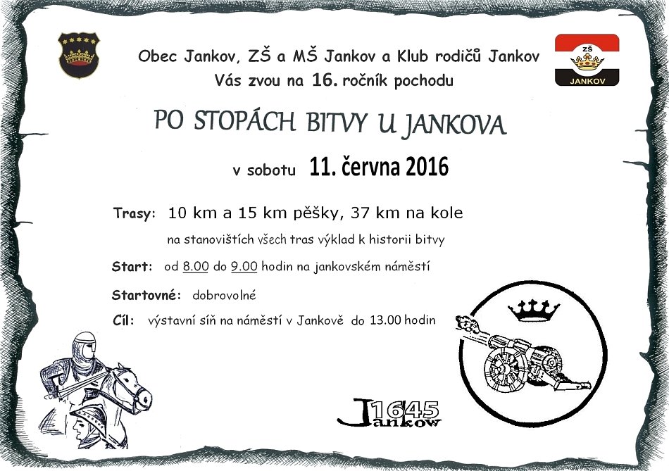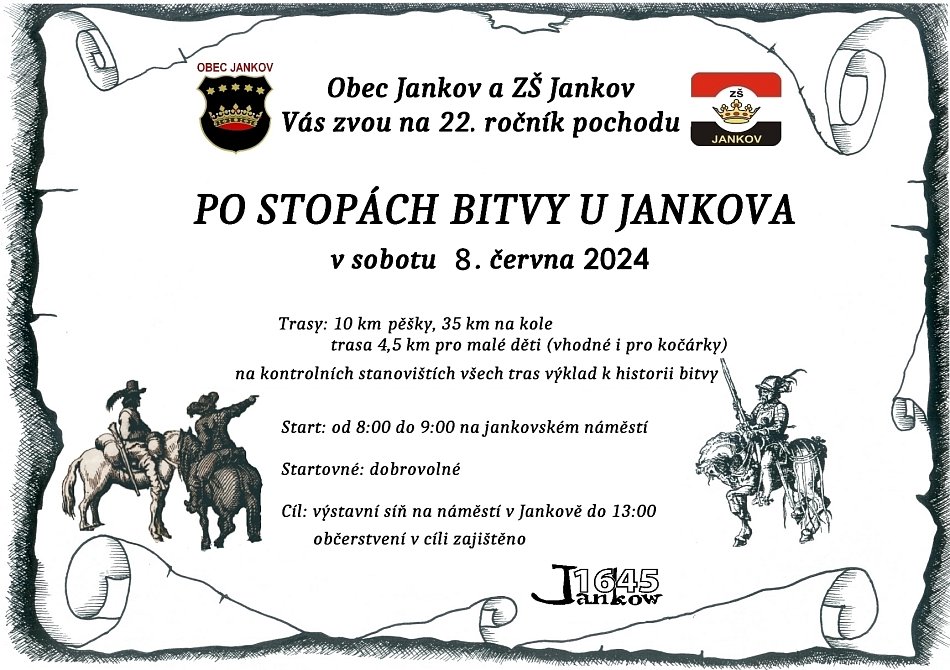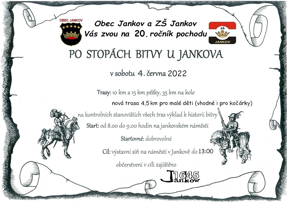 V sobotu 4.6. se uskutečnil již 20. ročník pochodu Po stopách bitvy u Jankova. Na zúčastněné čekaly 4 trasy-cyklistická o délce 35 km, dvě trasy 10 a 15 km pro pěší. Letos poprvé se této akce mohli zúčastnit i ti nejmenší, jelikož byla připravena i nová trasa o délce 4,5 km, kterou bylo možné absolvovat s kočárkem. Na kontrolních stanovištích čekali na turisty žáci jankovské školy v kostýmech, kteří je seznamovali s historií bitvy. Pochodníci tady také dostávali razítka jako důkaz, že daným místem skutečně prošli. Celým dnem provázelo sluníčko, a tak se pochod vyvedl. O tom svědčí i fakt, že se ráno na startu zaregistrovalo celkem 150 účastníků. Nikola Vaňková a Anna Lupačová, 6. třída