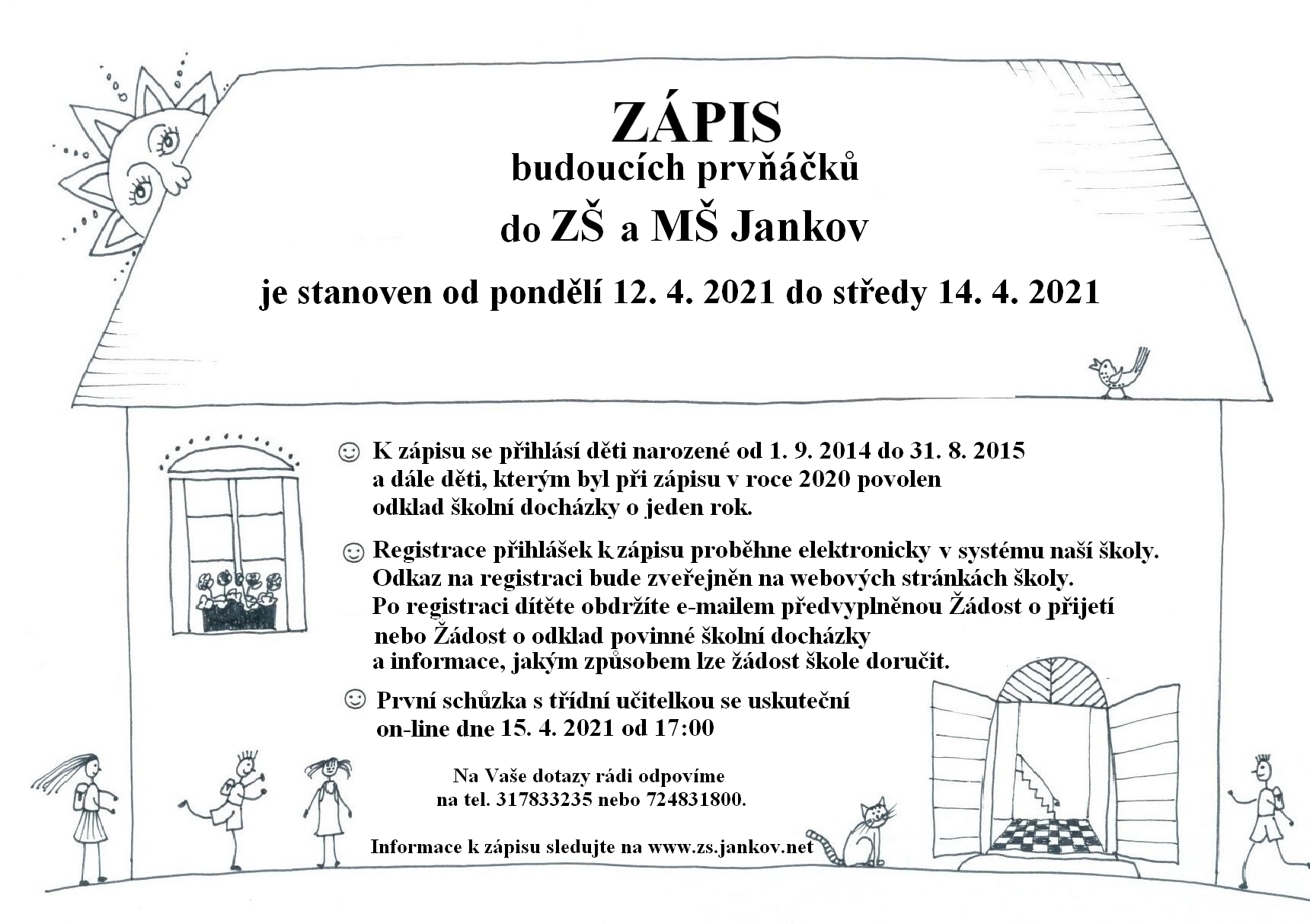 V průběhu schůzky budete informováni o podmínkách vzdělávání v jankovské škole a o průběhu zápisu k povinné školní docházce pro školní rok 2021/2022, který se uskuteční v termínu od 12. do 14. dubna 2021.