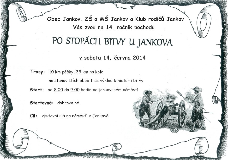 Obec Jankov, ZŠ a MŠ Jankov a Klub rodičů zvou všechny na XIV. ročník pochodu Po stopách bitvy u Jankova, který se uskuteční 14. června 2014. Můžete si vybrat z pěší trasy a cyklotrasy.