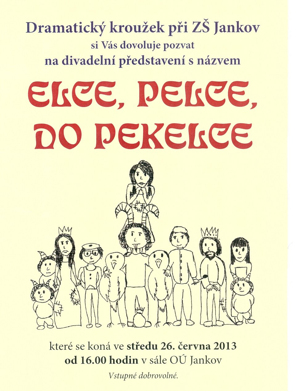 Ve středu 26. června nastal námi dlouho očekávaný den. Po dobu několika měsíců jsme s dětmi z dramatického kroužku jankovské školy nacvičovali divadelní představení s názvem Elce, Pelce, do pekelce. A věřte mi, že to opravdu nebylo jednoduché. Od počátku nácviků jsme se setkávali s mnoha problémy. Nejprve se děti vůbec nemohly naučit text, poté se ve škole rozšířila chřipka. A bylo po zkoušení. V neposlední řadě někteří žáci svou roli vzdali, a tak jsme chtěli celý kroužek rozpustit. Ale děti se nehodlaly tak snadno vzdát. Chtěly dokázat, že to zvládnou, že se obtížně zapamatovatelný text přeci jen naučí a svůj talent ukáží veřejnosti. Narychlo jsme tedy sehnali náhradníky a pokračovali jsme ve zkoušení. Velmi si obrovské snahy dětí cením a vážím si také toho, že divadlu věnovaly velké množství ze svého volného času. Samozřejmě jsme si o zkouškách užili také spoustu legrace, zasmáli jsme se množství přeřeků a často i dlouhých pauz, které ve scénáři napsané nebyly. Myslím si, že nakonec všechno dopadlo tak, jak si žáci za své úsilí zasloužili. Pro herce není přece nic krásnějšího, než být odměněn potleskem diváků. Mgr. Olga Kolářová