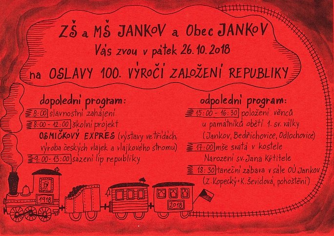 Obec Jankov a Základní škola a mateřská škola Jankov zvou všechny občany na Oslavy 100. výročí založení republiky, které se uskuteční v tento pátek 26. října.