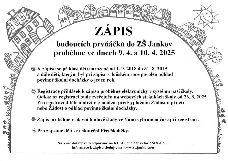 Ve dnech 9. a 10. dubna proběhl na Základní škole Jankov zápis do první třídy. Do školních lavic se přišlo zapsat 18 budoucích prvňáčků. Zápisem děti provázely pohádkové postavy – princezna, mraveneček, námořník, čarodějnice a další, které vytvořily kouzelnou atmosféru a pomohly dětem překonat počáteční ostych.