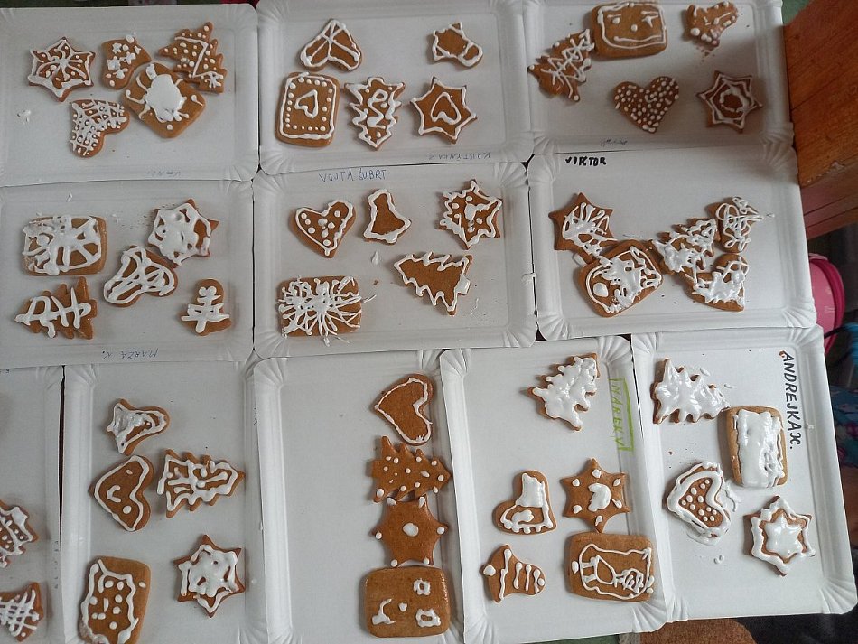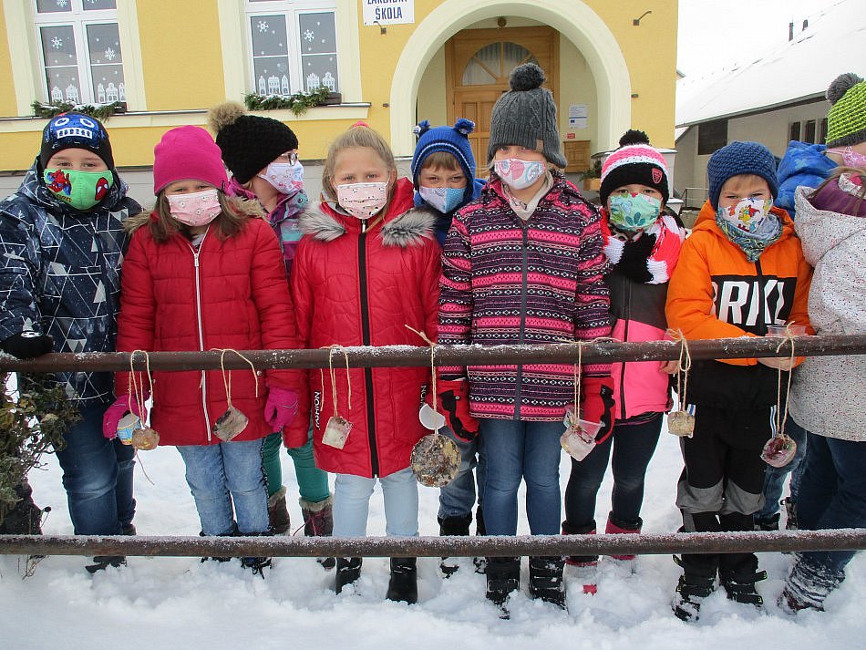 Přinesli si přírodní materiál (semínka, větvičky, suché květy, šípky, jeřabiny apod.), který naskládali do krabiček, přidali provázky, zalili vodou a dali s paní učitelkou za okna zmrznout. Druhý den si ozdoby navázali na zábradlí. Měli z nich velkou radost. Doufáme, že jsme na několik dní kolemjdoucím vykouzlili úsměv na tváři...